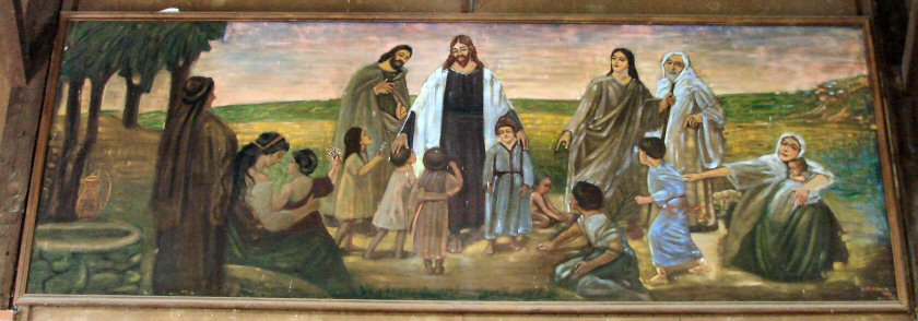 The second painting is at the front of the chapel and measures 16 1/2 feet wide by 6 feet tall. It has Honig's name and the dates 1918 and 1946. It is believed the painting was made in 1918 and hung at Camp Reveal in 1946.